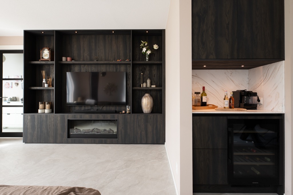 De wens was een complete keuken. Door goed te luisteren en mee te denken, ontstond een ontwerp waarin ook een koffiecorner werd opgenomen. En met een bijpassende kastenwand in de woonkamer, uitgevoerd in hetzelfde materiaal, is het één stijlvol en rustgevend geheel geworden.